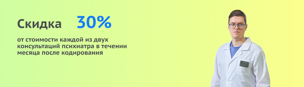 Скидка 30% от стоимости каждой из двух консультаций психиатра в течение месяца после кодирования.