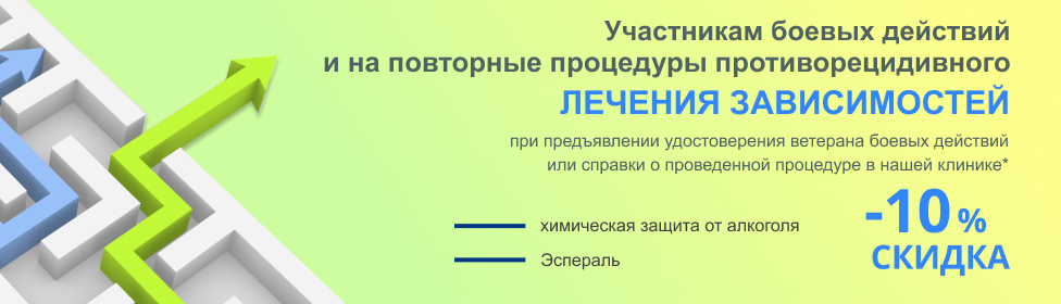 Скидки 10% предоставляются участникам боевых действий и на повторные процедуры противорецидивного лечения зависимостей: “Эспераль” (гель), “Эспераль”, “химическая защита от алкоголя” при предъявлении удостоверения ветерана боевых действий или справки о проведенной процедуре в нашей клинике.